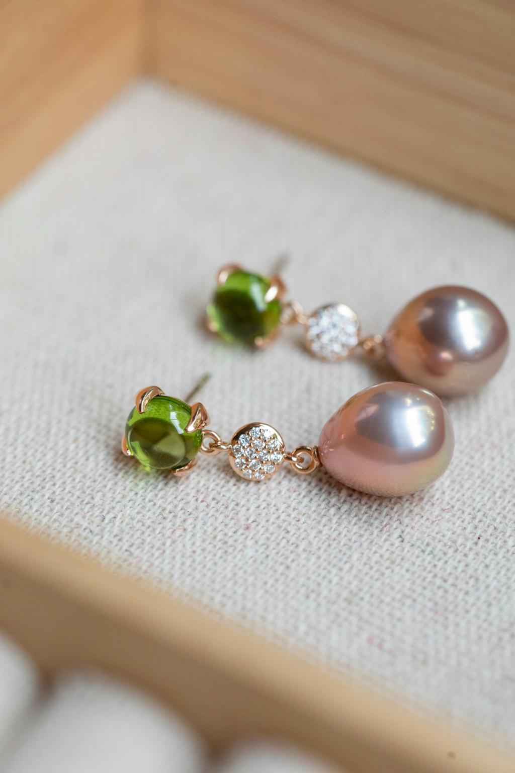 De Catch oorbellen van Bron, met modelnummer 8OR4858PECBRZRB11, zijn vervaardigd uit 18 karaats roségoud en stralen een verfijnde elegantie uit. De combinatie van levendige groene peridot en zachtroze zoetwaterparels zorgt voor een harmonieuze en luxueuze uitstraling. In het midden schittert een subtiele stardust van diamant, die de oorbellen een betoverend detail geeft. Een tijdloos sieraad dat moeiteloos klasse en vrouwelijkheid uitstraalt, perfect voor elke gelegenheid.