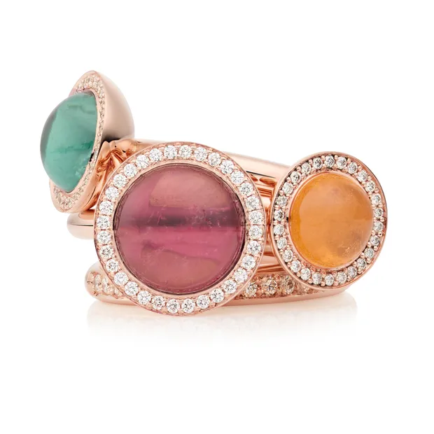 De Sushi ring is een verfijnde ring van 18 karaats roségoud, met een cabochon geslepen roze toermalijn en een ring van meerdere witte diamanten die de steen omarmen. Het referentienummer van deze ring is 8RR4925RTCBR.