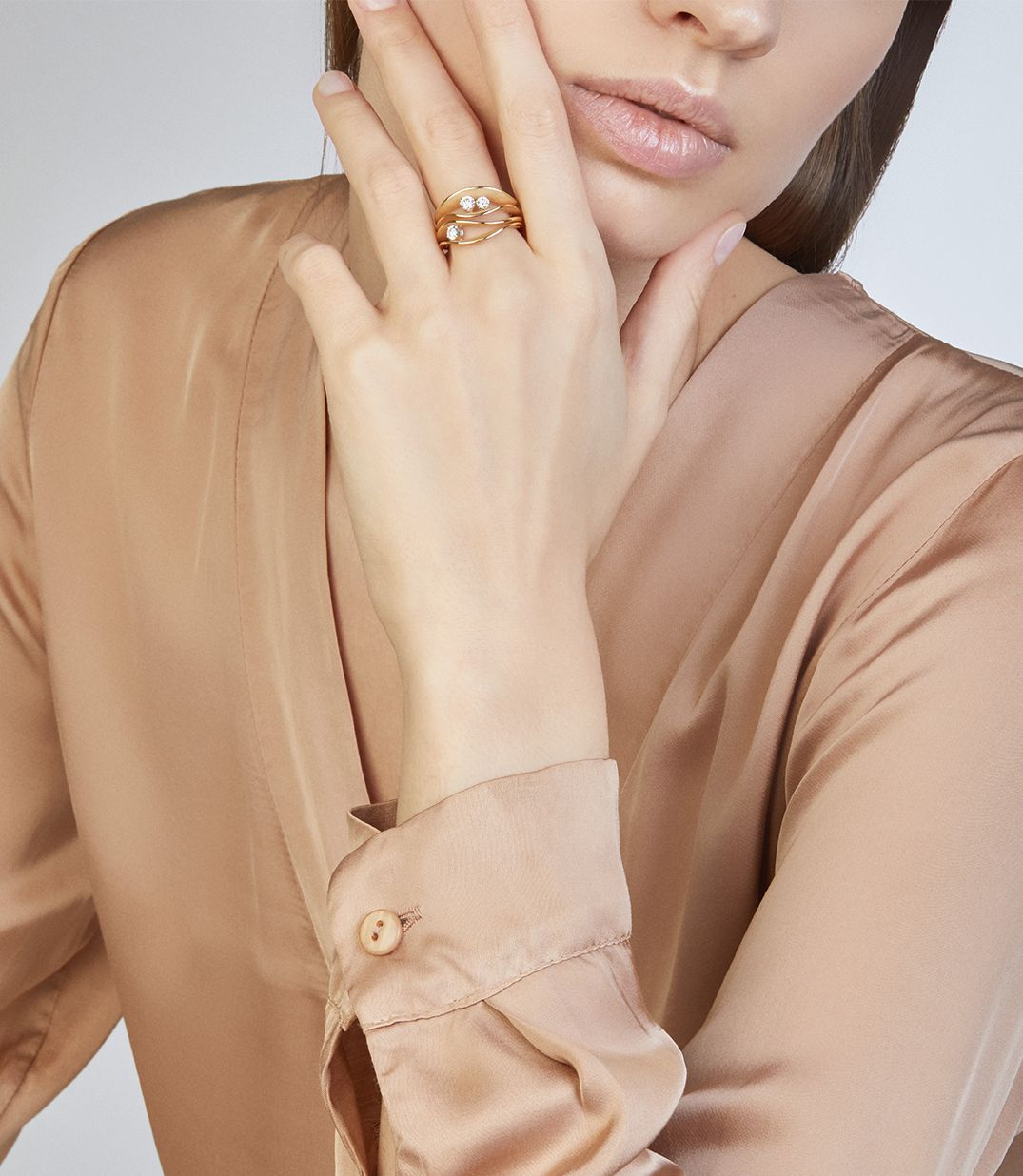 De ring is van 18-karaats Orange Apricot Gold, een warme abrikooskleur. Hij heeft vloeiende, golvende lijnen die samen een sculpturaal, duinachtig ontwerp vormen. In het ontwerp zitten diamanten met een totaal gewicht van 0,45 ct, subtiel verwerkt tussen de golvingen. De afwerking wisselt tussen fluweelmatte oppervlakken en glanzende randen, wat zorgt voor diepte en textuur.