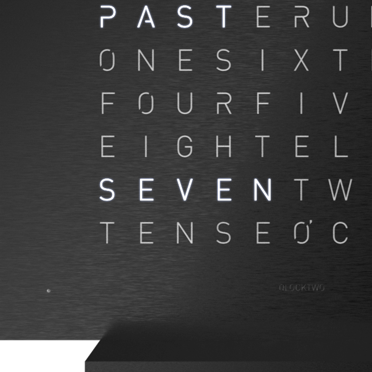De QLOCKTWO EARTH 13.5 DEEP BLACK bestaat uit een aluminium behuizing en voet, matzwart geanodiseerd, en een frontplaat van geborsteld roestvrij staal met een diepzwarte coating.